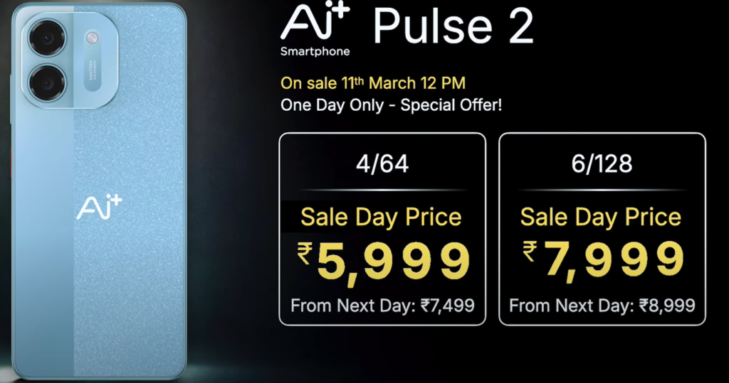 The AI+ Pulse 2 will go on sale in India starting 11th March at 12 PM as part of a special one-day launch offer. The 4GB + 64GB variant is priced at ₹5,999 for the sale day (₹7,499 afterward), while the 6GB + 128GB model will be available at ₹7,999 (₹8,999 after the offer period), making it one of the most competitively priced smartphones in its category.