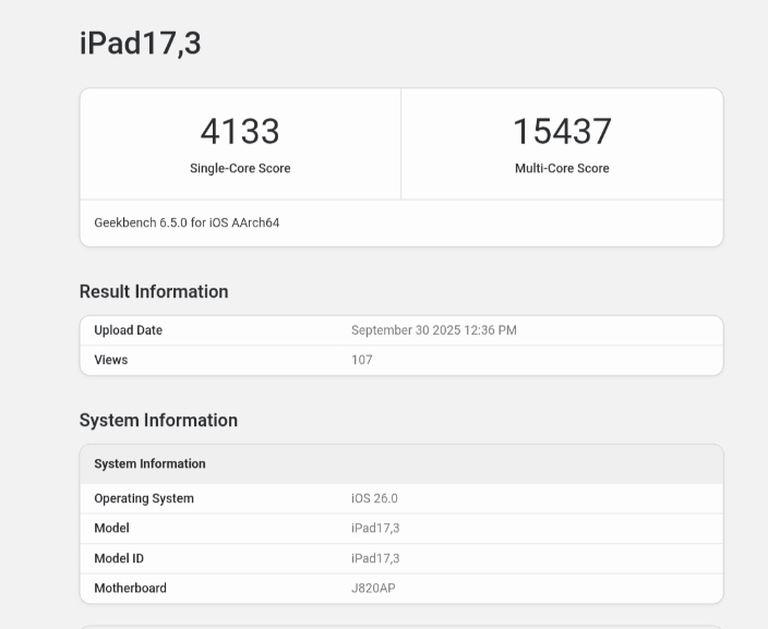 Geekbench Details: The listing shows the Apple M5 iPad Pro achieving a single-core score of 4,133 and a multi-core score of 15,437. On the GPU side, the Metal score reached 74,568. The M5 processor features a 3+6 core configuration clocked at 4.42GHz. The benchmarked model was running iOS 26.0 with 12GB of RAM. Additionally, the tablet posted an impressive AnTuTu score of 3,137,936.
