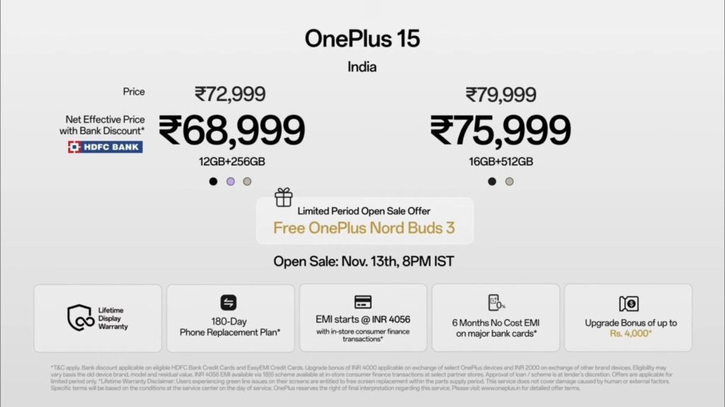 The OnePlus 15 is priced globally at Rs 72,999 / €949 / £849 / $899 / CA$1299 for the 12GB + 256GB configuration, while the 16GB + 512GB variant is available at Rs 79,999 / €999 / £879 / $999 / CA$1399.