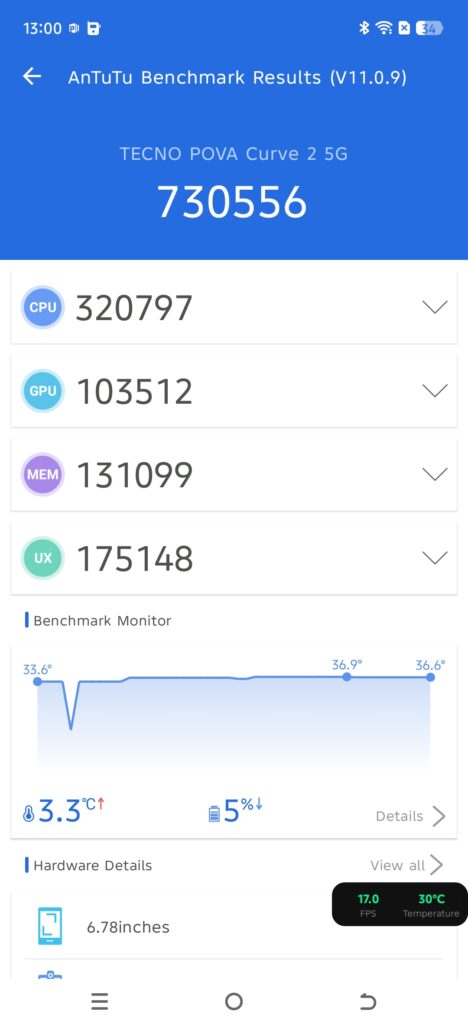 The TECNO POVA Curve 2 5G is fast and smooth in everyday use. Its Dimensity 7100 processor helps apps open quickly and games run nicely without much lag. In tests, the phone scored about 7.3 lakh on AnTuTu, which means it has strong performance for its price.