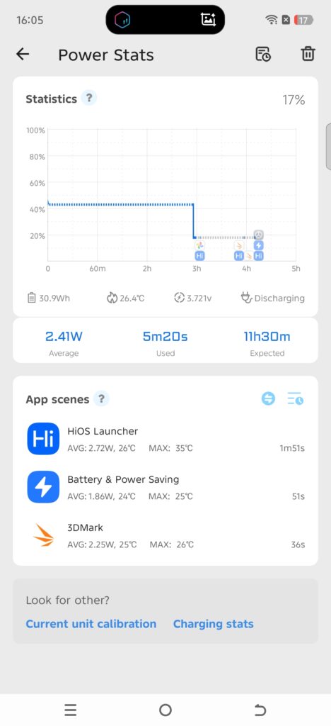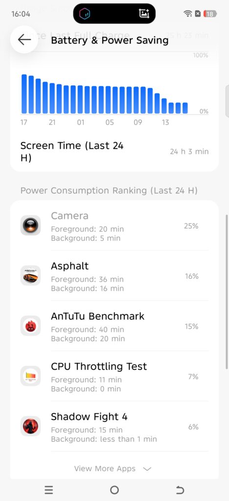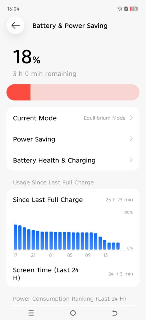 The screen time went over 24 hours in the stats, showing that the phone can handle heavy use like gaming, videos, and social media. When the battery reached around 18%, it still showed about 3 hours remaining, which is helpful when you are outside.