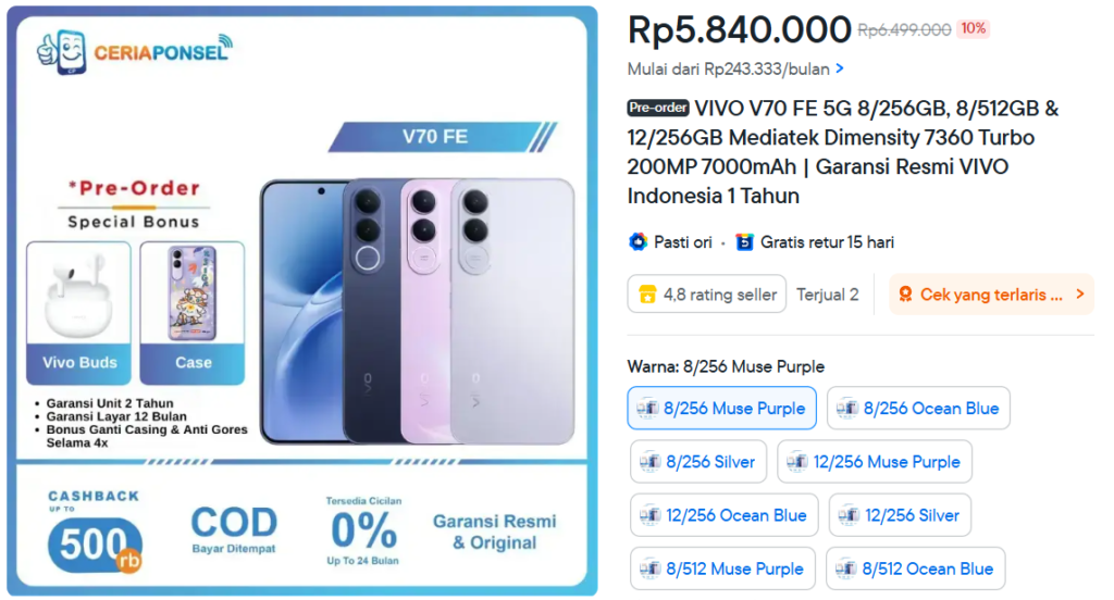The Vivo V70 FE 5G is listed at a discounted pre-order price of Rp5,840,000 (down from Rp6,499,000). Buyers who pre-order can receive bonuses such as Vivo Buds Air3 or a Popmart case, extended warranty benefits, screen protection, and free accessory replacements.