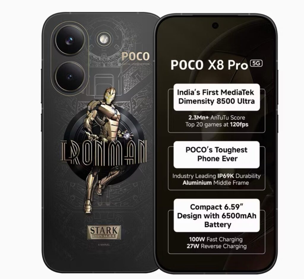 The POCO X8 Pro series stands out with MediaTek’s latest chipsets, high refresh rate displays, massive batteries, and flagship-level fast charging support. The lineup also introduces an exclusive Iron Man Edition for Marvel fans, adding a unique design element to the series.