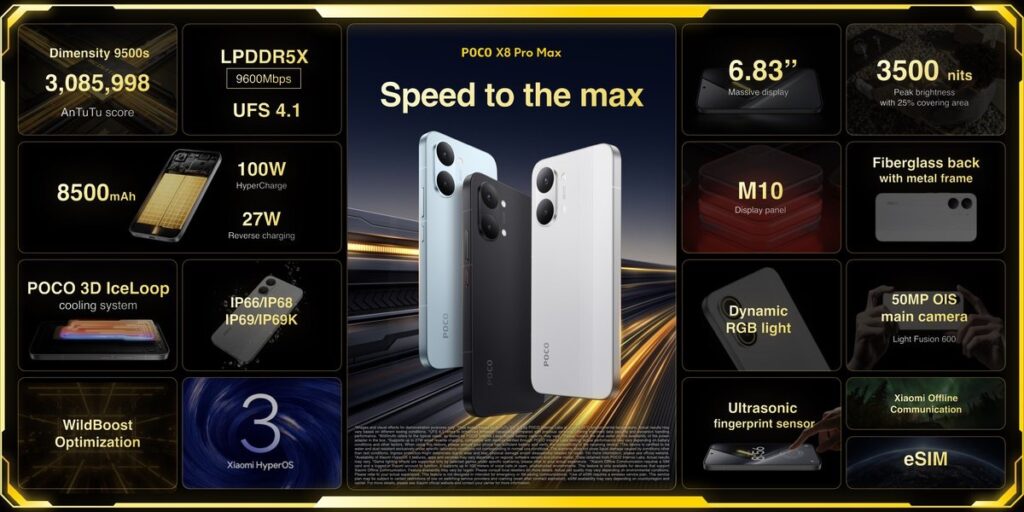The POCO X8 Pro Max takes things further with the MediaTek Dimensity 9500s chipset and a massive 9000mAh battery while maintaining a slim 8.2mm profile. It also supports 100W fast charging and reverse charging, making it one of the most battery-focused smartphones in its category.