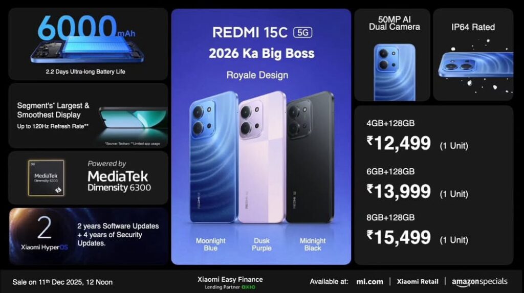Redmi has equipped the 15C 5G with a 50MP AI rear camera and an 8MP selfie sensor, offering respectable photography performance at this price range. The phone also packs a large 6000mAh battery paired with 33W fast charging, giving users extended backup for heavy usage. Additional highlights include an IP64 rating, a 3.5mm headphone jack, and three colour options—Moonlight Blue, Dusk Purple, and Midnight Black.